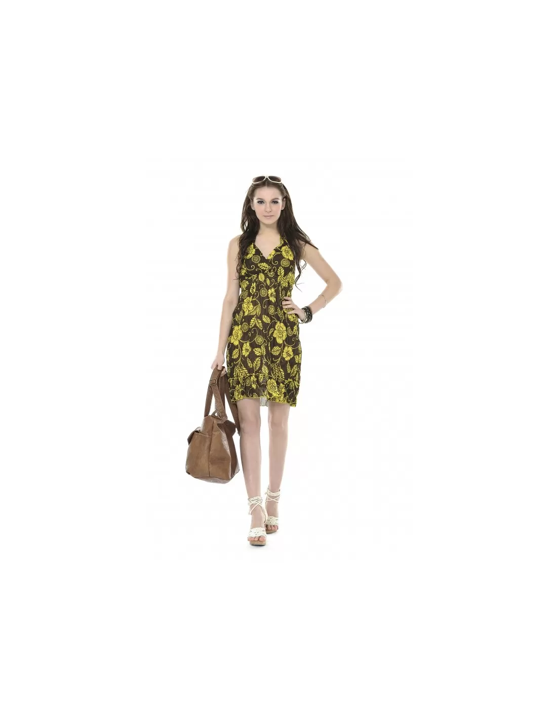 Sleeveless knee-length chiffon dress. V-neckline with elastic under the bust lining.