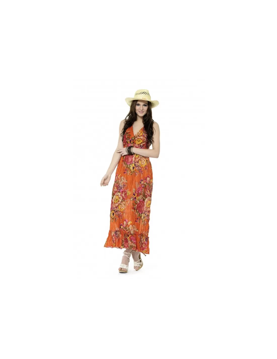 Long printed dress with thin adjustable straps. V-neckline and wiring under the bust with ruffles at the bottom of the dress.